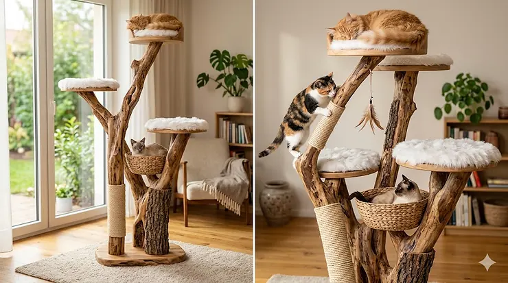 Walking into a modern living room and spotting a carpeted monstrosity covered in neon polyester isn’t anyone’s design dream. Yet for years, cat owners accepted that functional pet furniture meant aesthetic compromise. That equation changed when natural wood cat trees entered the market, bringing Scandinavian minimalism to feline furniture.